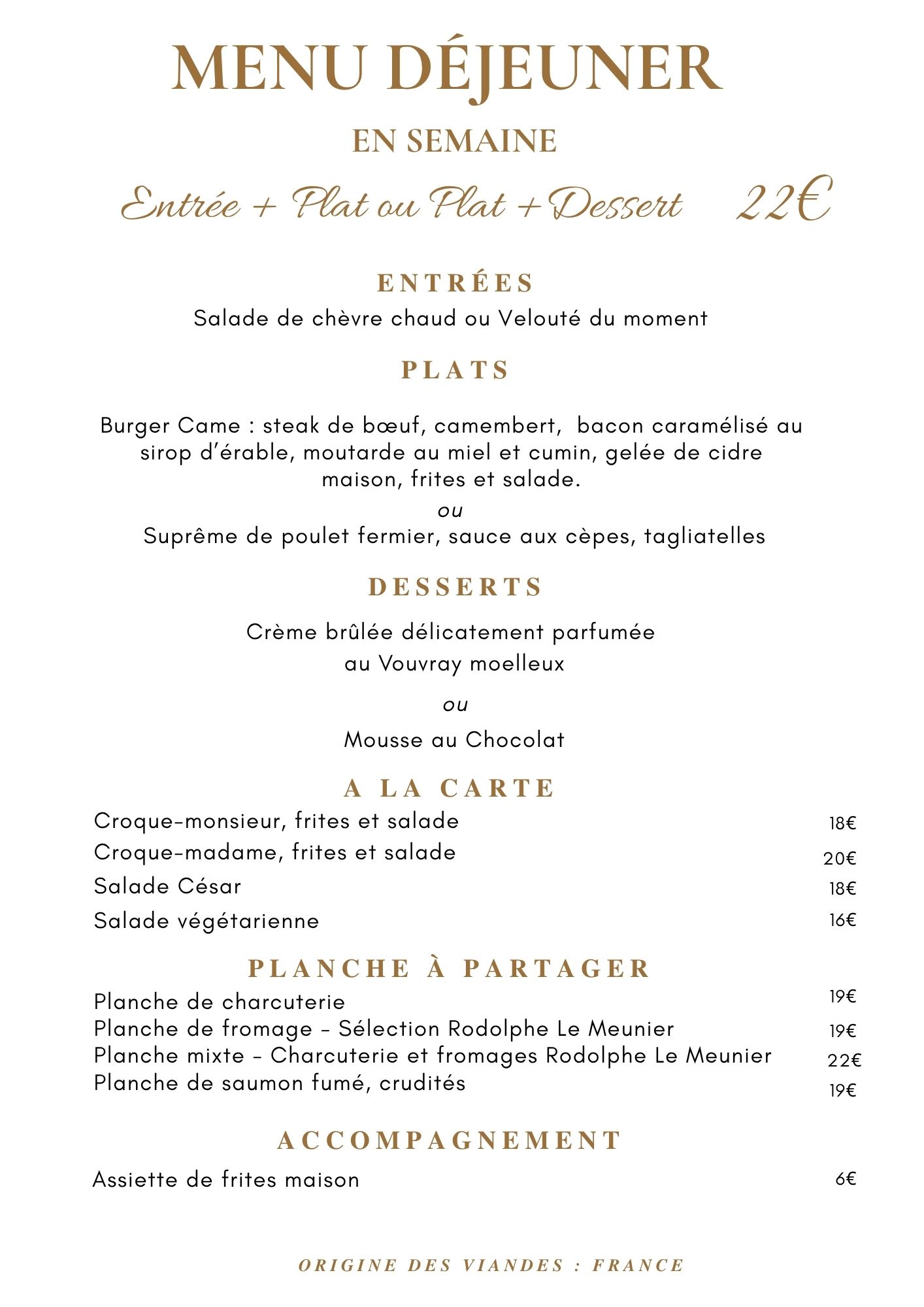 Sa cuisine est faite de rencontres, d’échanges et de partages. Tous nos plats sont faits maison à partir de produits frais locaux. Pour plus de gourmandise, nous vous proposons du pain maison de notre boulanger.
